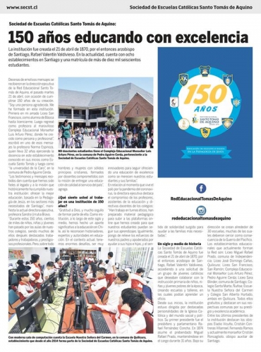 El artículo comienza destacando los mensajes que se recibieron el martes 21 de abril, con ocasión de cumplirse ese día los 150 años de la creación de la Sociedad de Escuelas Católicas de Santo Tomás de Aquino, fundada en 1870 por el entonces arzobispo de Santiago, monseñor Rafael Valentín Valdivieso.